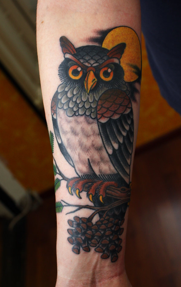 Viimeisteltiin Tonin pöllö tänään. Ensimmäisellä kerralla tehtiin linjat ja suurin osa varjostuksista. Nyt lisättiin kuu ja värit. Olen aika tyytyväinen tän väreihin, tai oikeastaan värittömyyteen. Rajattu paletti toimii monissa aiheissa pahaiten.