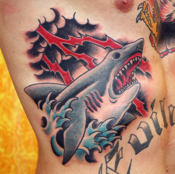 Matti kävi jatkamassa kylkikuvaansa. Kylki on yksi kivuliaimmista paikoista ottaa tatuointi. Yllä oleva valokuvakuva on Jussi Saarelan ottama. Alla valmistunut tatuointi.