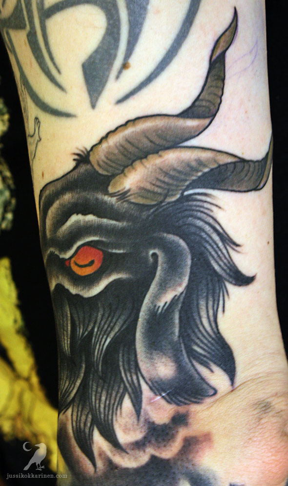 Pääsin tekemään Andelle mustan vuohen pään. Tälläisiä tatuointeja olis siistii tehdä lisää. Yläpuolella näkyvät muut tatuoinnit eivät ole mun tekemiä.