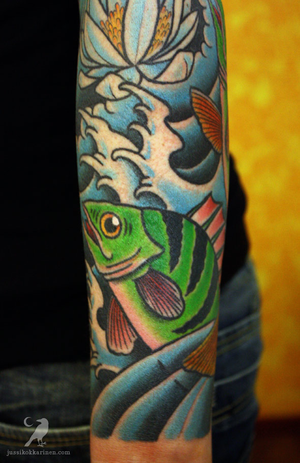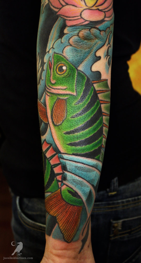 Viimeisteltiin toissa viikolla Antun ahvenhiha loppuun. Alemman kuvan fisu, kaikki taustat ja linjat ovat parantuneita. Ylemmän otuksen väritys on tuore ja kiiltävä. Koko homma on jatkoa joskus sata vuotta sitten tehdylle puolihihalle. Ahvenet on aika härskin vihreitä, mutta joskus tatuoinnit on totuutta ihmeellisempiä.