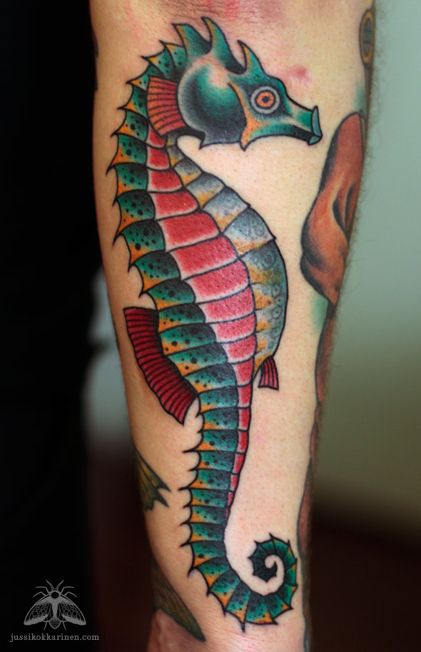 Andelle olen saanut tehdä monta siistii tatuointiaihetta. Tässä yksi niistä. Näin isoa merihevosta en ole pääsyt ennen tekemään. En tiedä olenko tehnyt yhtään pienempääkään.