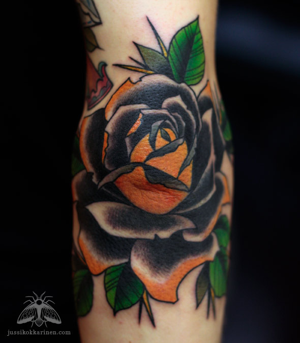 Musta-keltainen ruusu kyynärpäässä