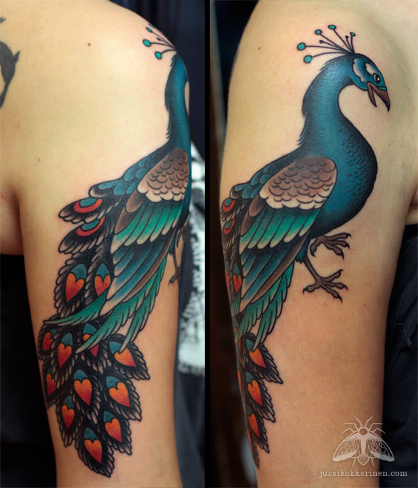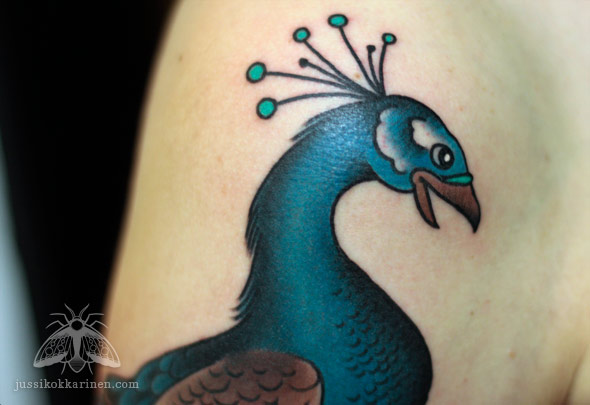 Ehkä ensimmäinen kokonainen riikinkukko, minkä olen päässyt tekemään. Niitä sulkia on tehty enemmänkin. Tatuointi kiertää sen verran ympäri olkavartta, että se piti kuvata useassa osassa.