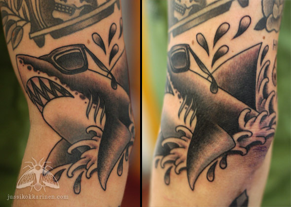 Eläintenpäät toimivat usein tatuointeina. Etenkin vähänkin hurjemmat elukat. Mikon aurinkolasipäisen hain ja vanhojen tatuointien väliin jäi sopiva rako vielä humoristisemmalle kuvalle.