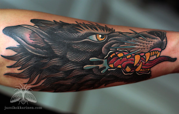 Sain tehdä Riikolle reippaan kokoisen sudenpään. Iso koko mahdollisiti hieman yksityiskohtaisemman toteutuksen, mikä teki aiheesta vielä hauskemman tatuoida. Kiitti.