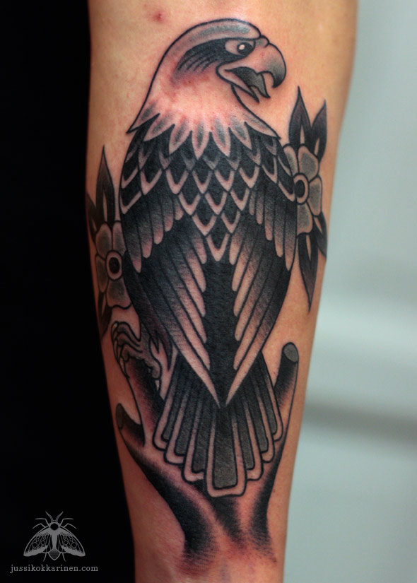 Ottaessaan pantterin päätä aikaisemmin syksyllä, mika valitsi seuraavaksi tatuoinniksi kotkan suoraan seinältä. Piirsin vanhaa flashia mukaillen uuden version tästä klassikosta. Näitä on kyllä hauska tehdä. Kiitti.