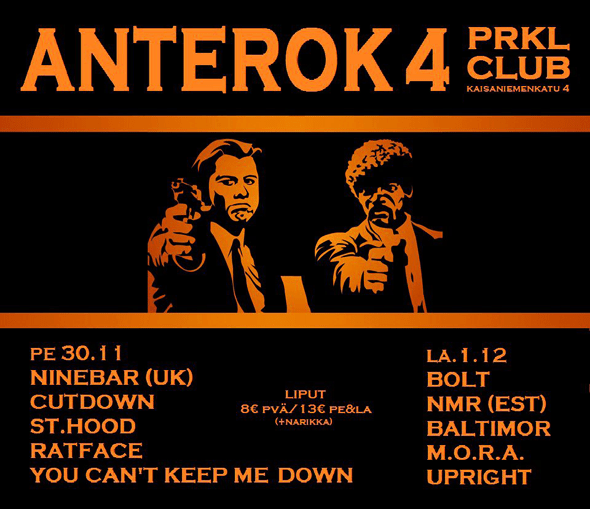 Ensi viikonloppuna juhlitaan pikkujouluja vuoden kovimmassa hardocore punk tapahtumassa. Anterok 4, Kaisaniemen PRKL Clubilla. Itse ehdin lappeenrannan Raining Blood Tattoo vierailultani mukaan vasta lauantaiksi, mutta perjantaitakaan en haluaisi missata. 09HC!