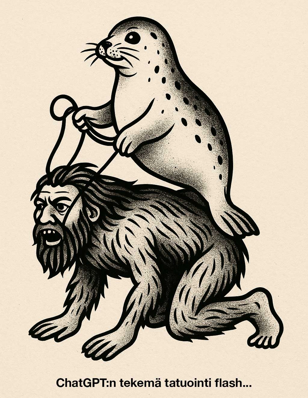 Joskus tulee tehtäväksi aihe, mitä ei ole tullut vastaan koskaan aikaisemmin. Kuten tämä Heikin toive, kun olin menossa huhtikuussa 2024 Lappeenrantaan vierailemaan Raining Blood Tattoohon. “Saimaannorppa, joka ratsastaa villimiehen selässä. Villimies vois olla nelinkontin ja sil vois olla suitset. Norppa pitää toisella räpylällä suitsista ja toisessa ois vety.” Saadessani tehtävänannon, olin juuri viestitellyt Raining Bloodin Juhan kanssa. Hän oli saanut asiakkaalta referenssiksi tekoälyllä tehtyjä kuvia. Kokeilin silloin, mitä tulisi, jos Heikin aihe syötetään tekoälylle. No en saanut mitään kuvaa aikaiseksi. Ei auttanut kuin piirtää kuva itse! Ja oli kyl hauskin piirrettävä vähään aikaan. Nyt puolitoista vuotta myöhemmin, kun postasin kyseisen tatuoinnin Instagrammiin, päätin piruuttani kokeilla saisiko tekoäly aiheesta nyt jonkin kuvan. No nyt tuli kuva, mutta mielestäni itse onnistuin paremmin. Alla ensimmäisenä Instagrammista napattuna mun tekemä tatuointi aiheesta ja toisena tekoälyn tuotos.