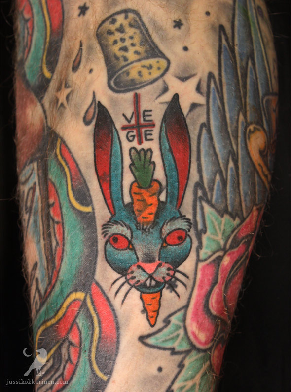 Kovimmat jätkät ottaa pehmeimmät tatuoinnit. Vegekani tuli vanhojen taustojen päälle. Siksi kuvan alle jäi näymään hassusti muutama tähti ja piste. Samalla meni pupun silmät kieroon kun toinen pupilli oli ihossa valmiina.